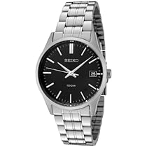 Featuring a minimalist design with classic analog style the Seiko Men's Black Dial Stainless Steel Watch is ready to complement a three-button suit for an important board meeting or a short-sleeve chino on your favorite golf course. The watch's stainless steel link bracelet (which closes with a fold-over double-push-button safety clasp) provides contrast for the watch's black dial. The dial features silver-toned hands and baton hour markers. Backed by a stainless steel case and protected by a mineral Hardlex crystal the watch's black dial also features a date window at the three o'clock position. Other features include a textured crown reliable Japanese quartz movement and water-resistance to 330 feet (100 meters).